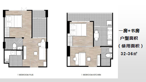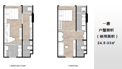 房型主打小面积,高利用率,室内多储藏空间,部分房型配置衣帽间。